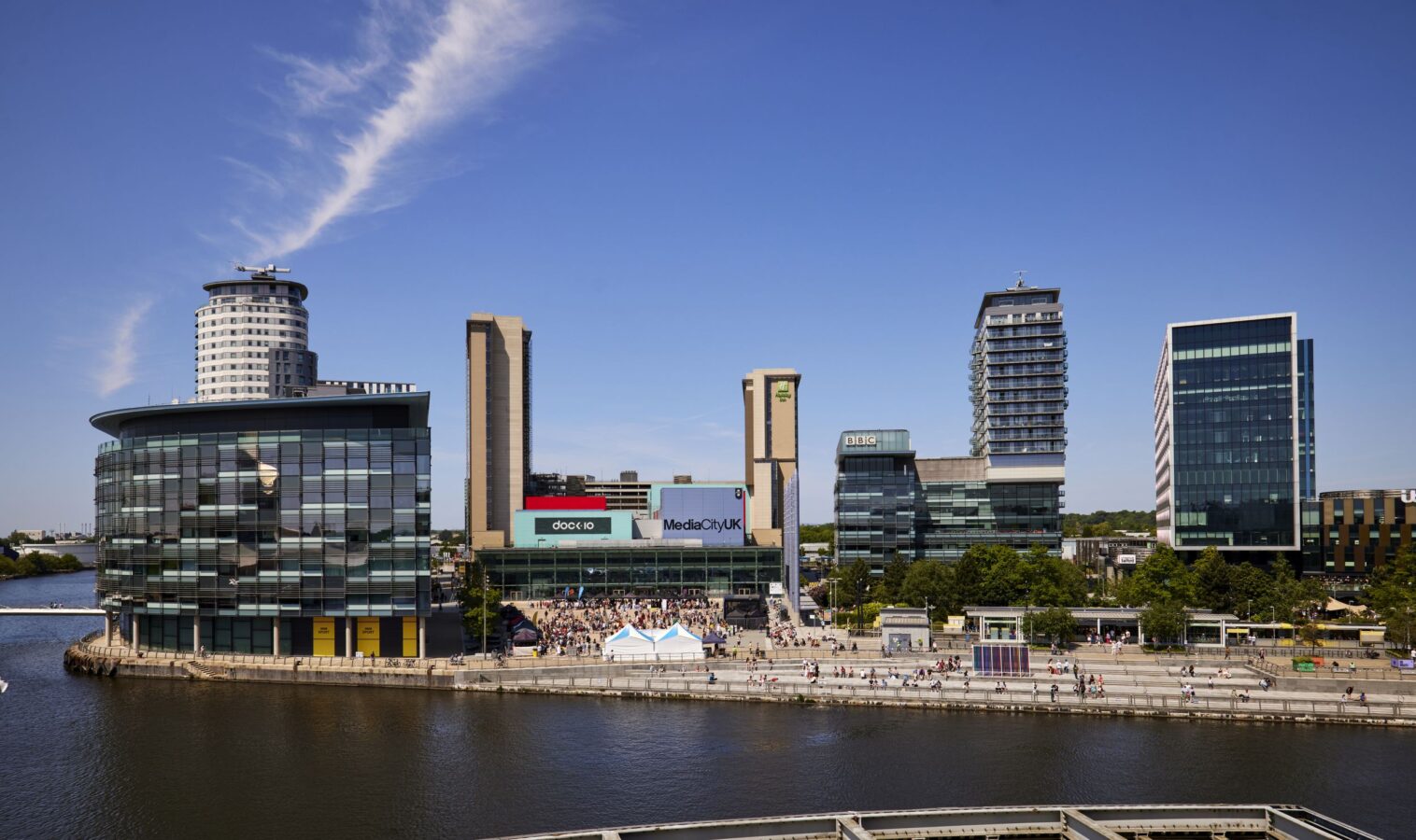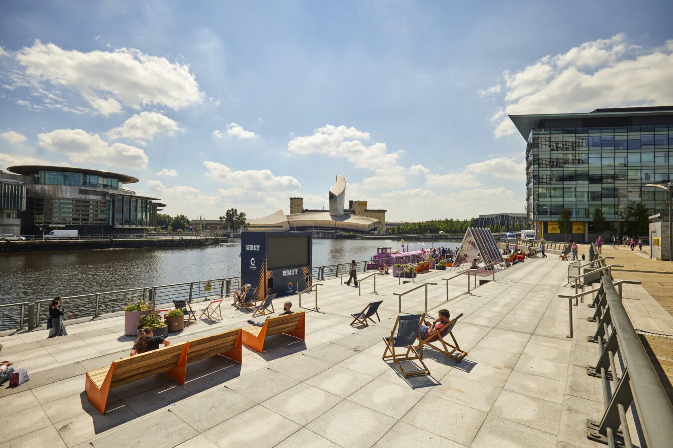 Our new waterfront hang-out space with its beautiful planters, colourful seating and deckchairs overlooking dock 10 is more like Sorrento than Salford.