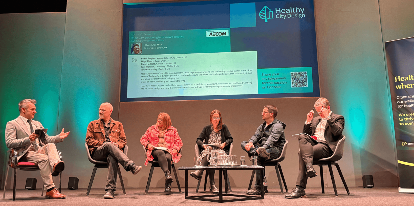 Key players representing MediaCity’s community joined together to share their insights into how our leading creative cluster integrates culture and innovation as well as health and wellbeing into its environment. Nigel Moore – Fuzzy Duck, Kate Hadfield – Carbon Creative, Sam Ingleson – The University of Salford, Jonathan Harley dock10 and Stephen Young – Salford City Council.